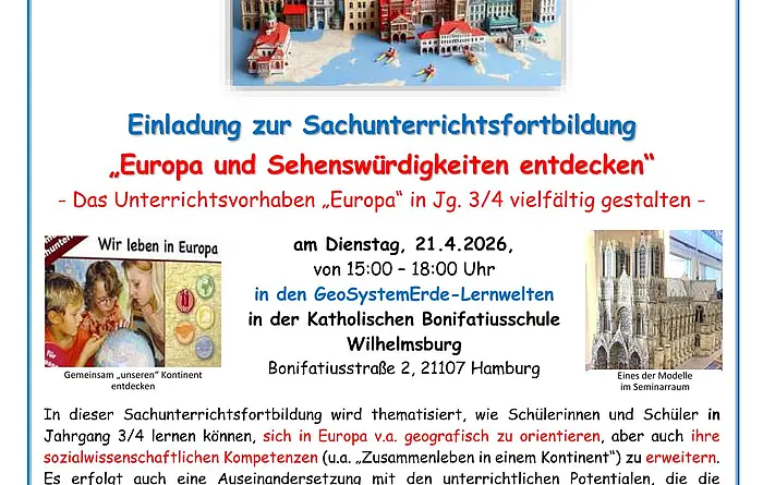 Am 21.04.2026 bietet das LI eine Lehrerfortbildung im Fach Sachunterricht zum Thema Europa mit Martin Kelpe im GeosystemErde-Raum an der Boni an.… Weiterlesen