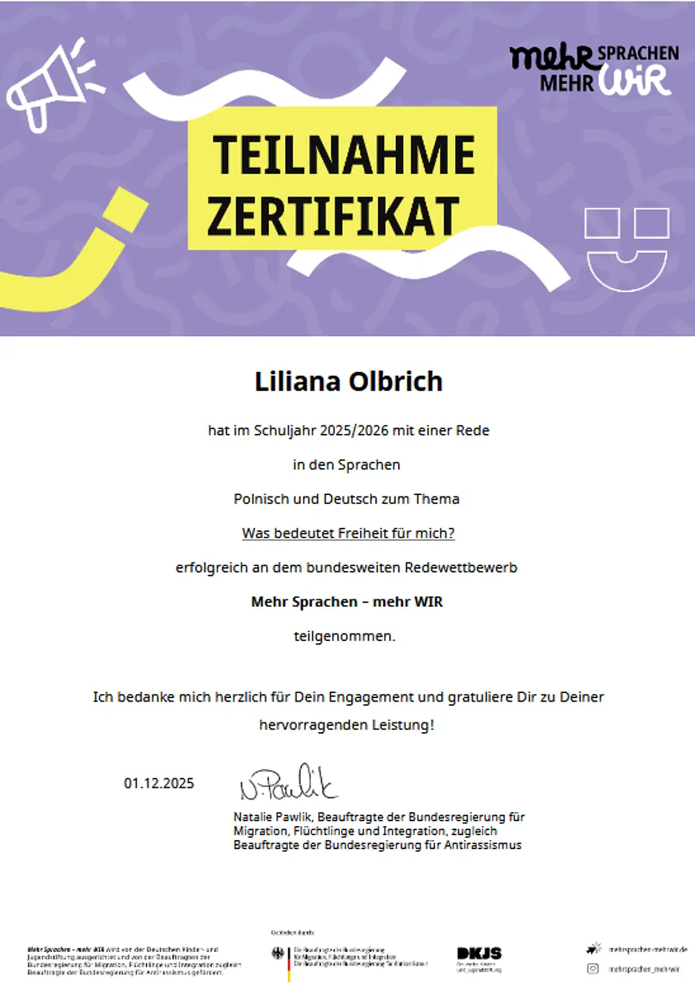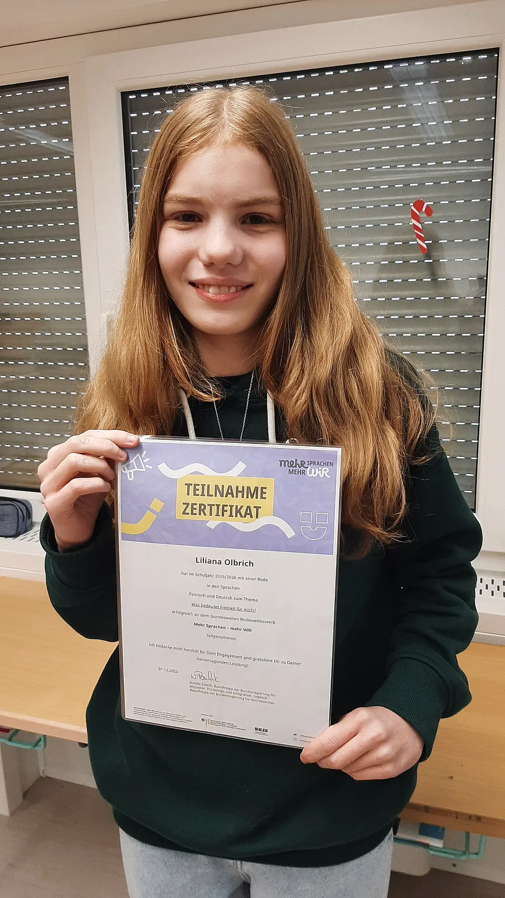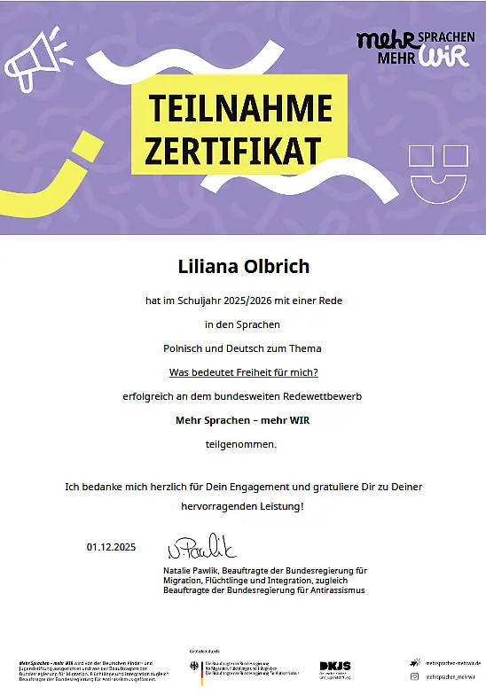 Unsere Schülerin Liliana Olbrich trat in dem Mehrsprachen-Wettbewerb mit großem Engagement und sprachlicher Sicherheit in zwei Sprachen an: Deutsch und Polnisch. In einem Video trug sie einen selbst verfassten Text vor mit dem Thema „Was bedeutet Freiheit für mich?“. Dabei bewies sie nicht nur ein hohes Maß an Sprachkompetenz, sondern auch interkulturelles Verständnis und Freude am sprachlichen Ausdruck. Besonders hervorzuheben ist ihre Fähigkeit, zwischen den beiden Sprachen sicher zu wechseln und Inhalte klar, kreativ und präzise zu vermitteln. Durch ihren Einsatz und ihre Motivation leistete sie einen wertvollen Beitrag zum Wettbewerb und stellte eindrucksvoll unter Beweis, wie bereichernd Mehrsprachigkeit ist.