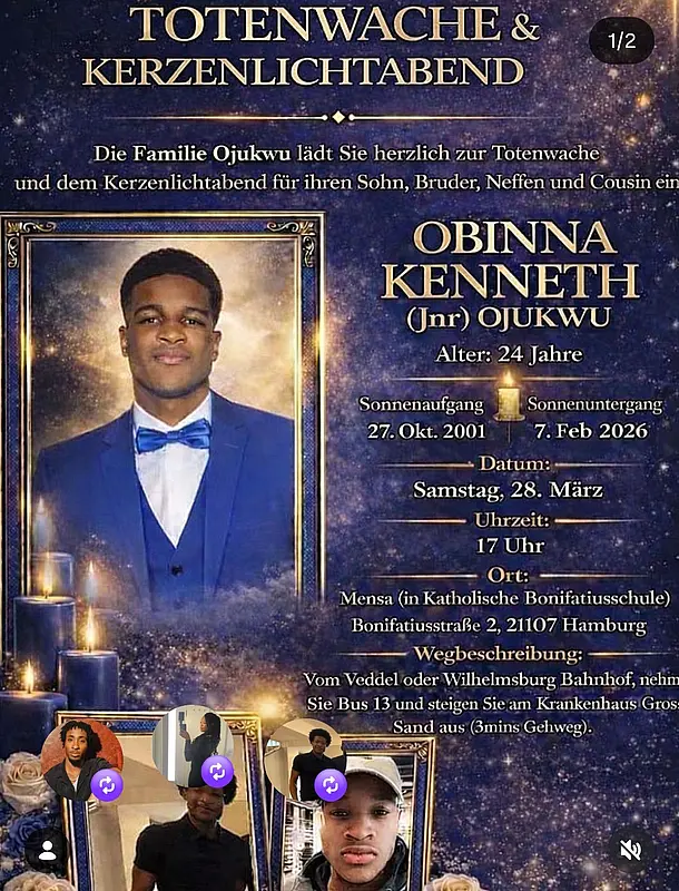 Am Sonnabend, dem 28. März um 17:00 Uhr lädt Familie Ojukwu Freunde, Wegbegleiter, Mitschülerinnen und Mitschüler sowie alle Menschen, die Anteil nehmen möchten, zu einem Trauerabend in die Mensa der Schule ein.